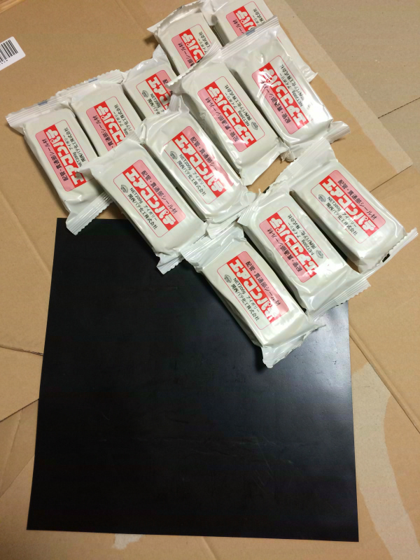 ドドーン。エアコンパテ200gを12個と、30cm四方の厚さ1mmゴムシート